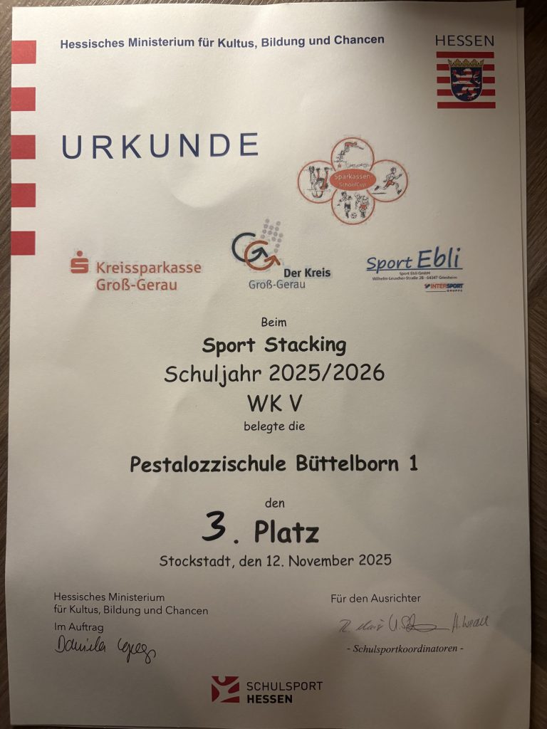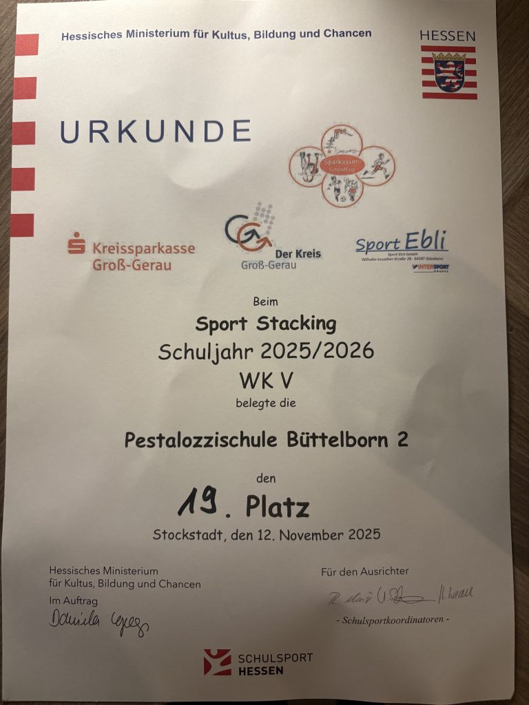 Am 12. November fand in Stockstadt das diesjährige Speedstacking-Turnier der Grundschulen im Kreis Groß-Gerau statt. Die Pestalozzi-Schule war mit zwei Mannschaften vertreten, die sich mit insgesamt 30 weiteren Teams im schnellen Becherstapeln messen durften.